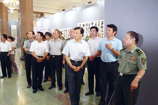 2011年8月25日,中共中央政治局委员、中央书记处书记、中宣部部长刘云山(右四)参观北京世纪名人国际书画院与中国书法家协会联合主办的“李铎诗词书法展”